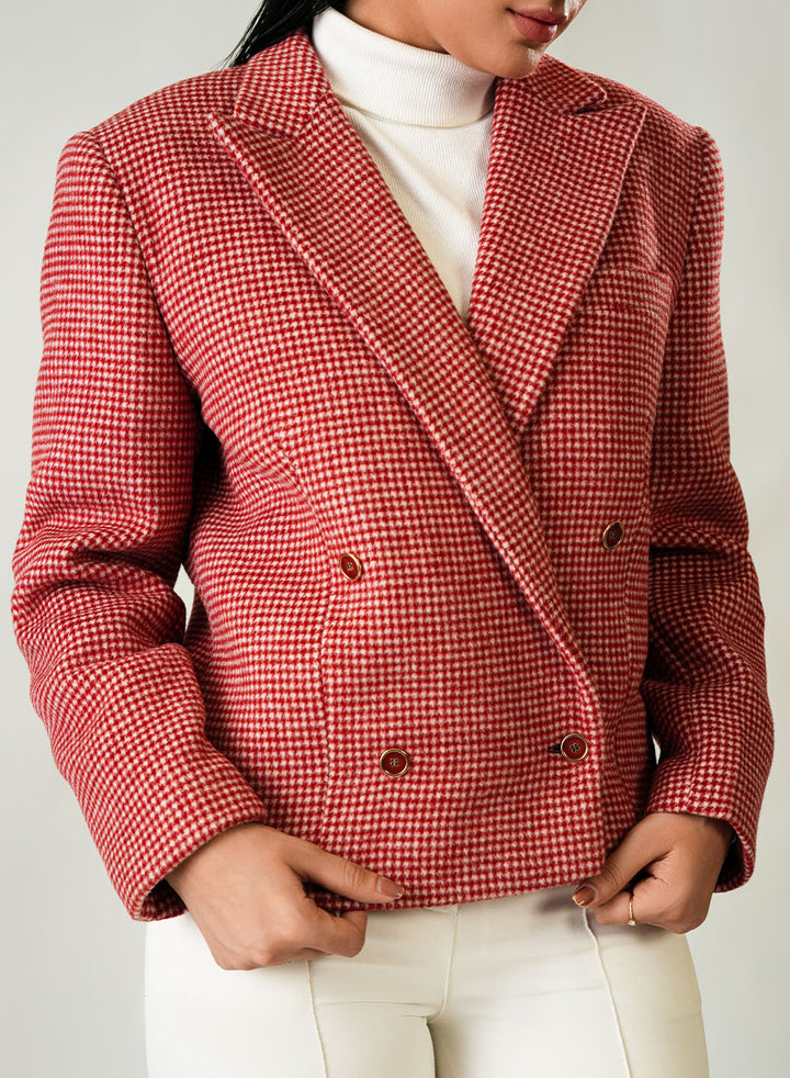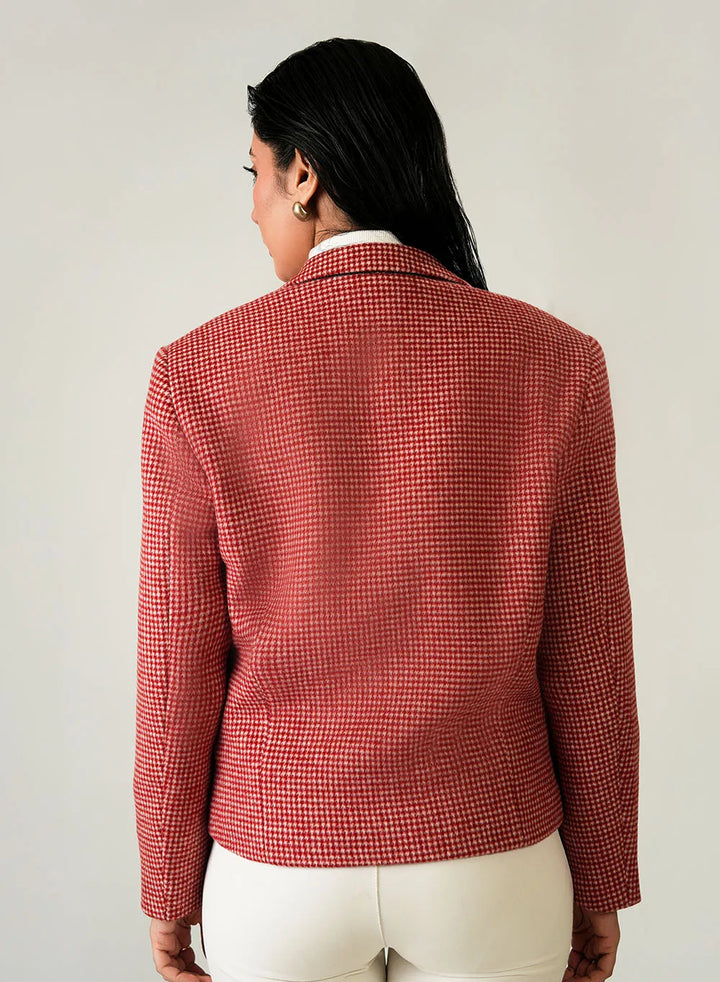 Red and white checked woolen fleece jacket for women, winter fashion