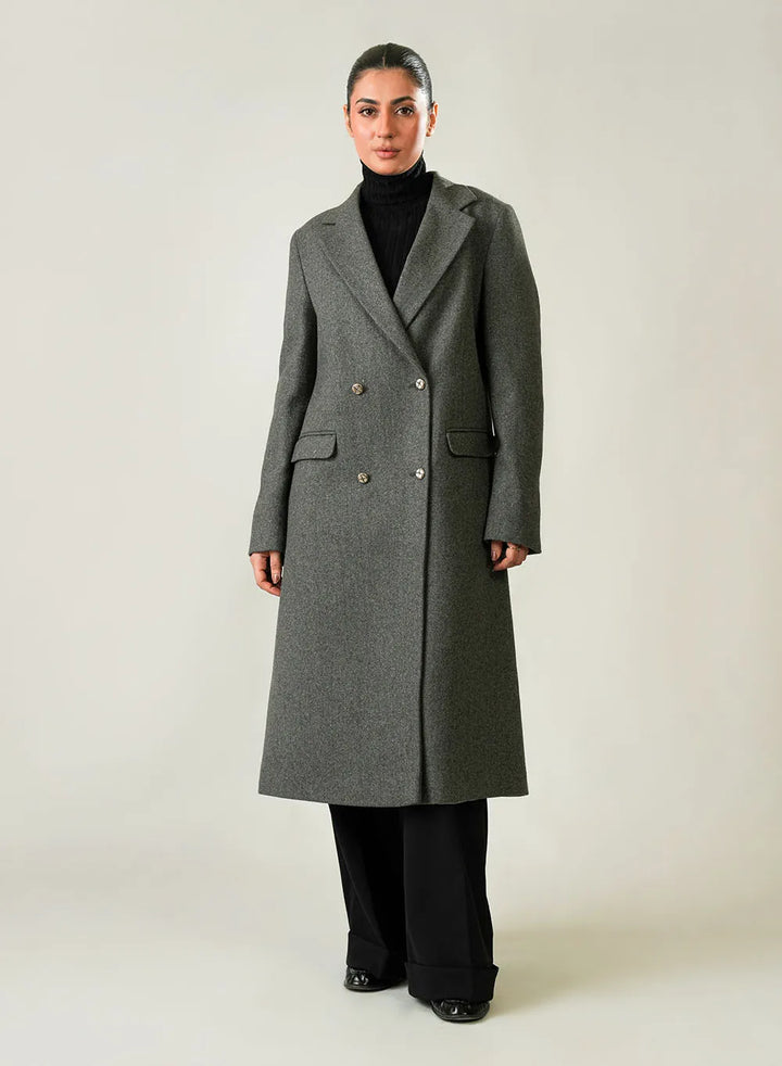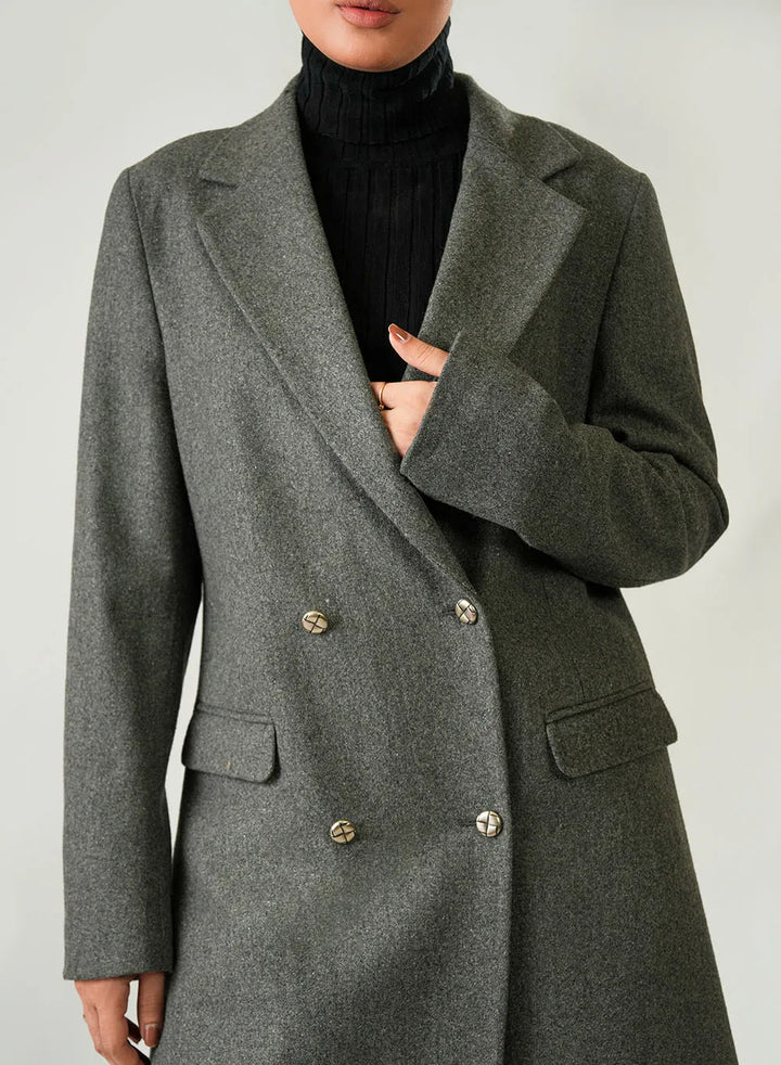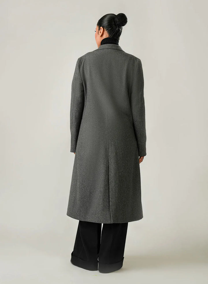 Ladies Long Coat - Lapel Collar Charcoal Grey Plain