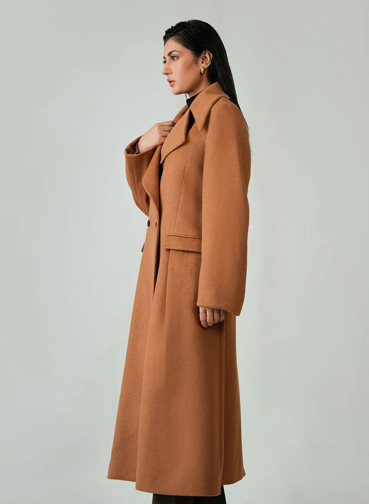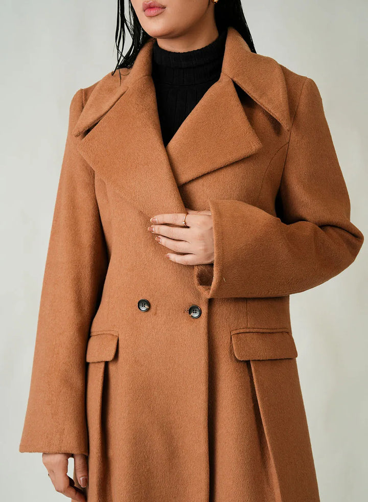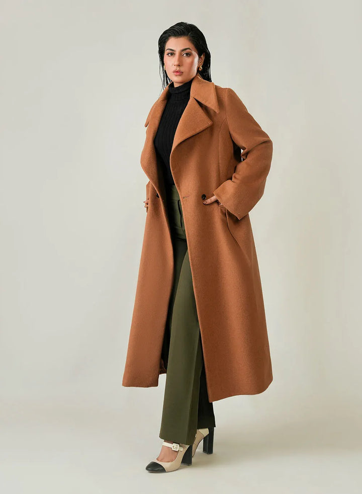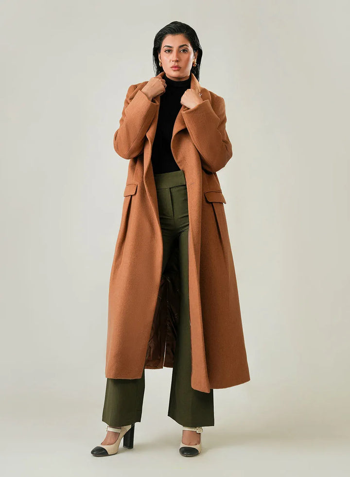 Ladies Long Coat - Woolen Fleece Camal Brown Plain